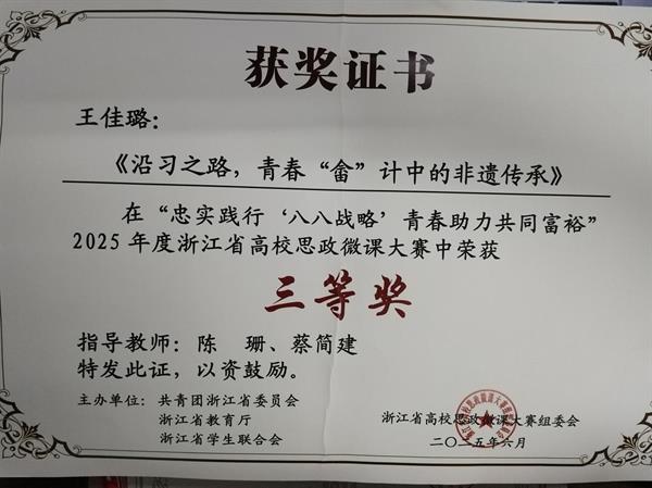 近日,由共青团浙江省委员会、浙江省教育厅、浙江省学生联合会主办的“忠实践行‘八八战略’ 青春助力共同富裕”2025年度浙江省高校思政微课大赛圆满落幕。本次大赛吸引了来自全省107所高校的610名优秀选手同台竞技,经过激烈角逐,市场营销专业陈珊老师指导的作品《沿习之路,青春“畲”计中的非遗传承》荣获学生组三等奖。