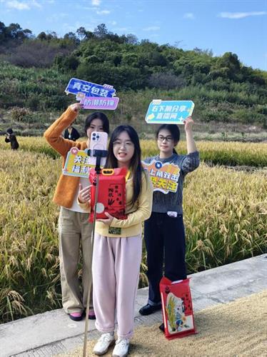 在金色的稻田边,学生们迅速架起直播设备,化身“助农主播”,热情的向线上观众介绍产品。他们灵活运用《直播电商》、《网络营销》等课程所学的知识与技巧,从产品定位到营销话术,清晰生动地讲解了冷水大米“高山冷泉灌溉、180天生长期”的独特价值,并突出其“米粒饱满、软糯弹牙、冷食不硬”的品质优质。专业的讲解与互动,有效吸引了线上观众的关注与购买,成功让这款优质农产品借助电商平台走出乡村,迈向更广阔的市场。
