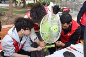 活动期间,志愿服务队针对老年居民常用的电饭煲、电暖器、收音机等小家电提供免费维修服务。现场维修组在广场上设立固定服务点,严格遵循 “登记 - 检测 - 诊断 - 维修 - 调试 - 告知” 流程,对居民送来的电饭煲、电风扇、电水壶等小家电逐一排查故障。针对线路老化、电容损坏、接触不良等常见问题,师生运用电路检测、元件焊接等专业技能开展维修;同时向老年居民普及家电保养知识、超期服役家电安全隐患及识别方法。