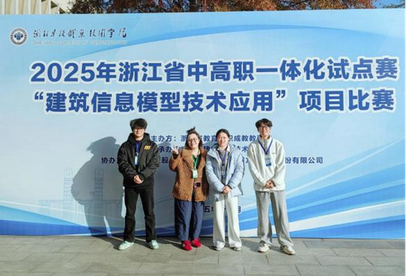 与此同时,在浙江省中高职一体化试点赛建筑信息模型技术应用项目中,我校参赛团队获得二等奖1项、三等奖1项。其中一支队伍与宁波行知中等职业学校组队,在崔逸琼和钟杰(中职)两位老师的指导下协同作战;另一支队伍则与宁波第二技师学院组队,由崔逸琼和相明钰(中职)两位老师负责指导。两支队伍均凭借规范的操作流程、高效的团队协作和优质的作品呈现,赢得了评委的认可。