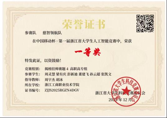 近日,第一届“中国移动杯”浙江省大学生人工智能竞赛圆满落幕。我校慈溪学院电子信息工程技术专业选派学生组成参赛团队,在指导教师的精心指导下,凭借扎实的专业基础和突出的工程实践能力,从全省众多高校队伍中脱颖而出,荣获省级一等奖,充分展示了专业建设与人才培养的阶段性成果。