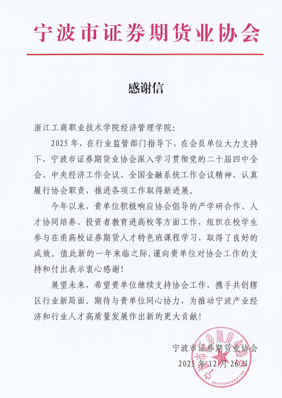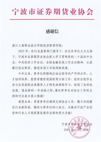 近日,我院收到了宁波市证券期货业协会发来的感谢信,信中既肯定了双方在金融人才协同培养上的落地成效,也为后续深化多维度合作传递了积极信号。