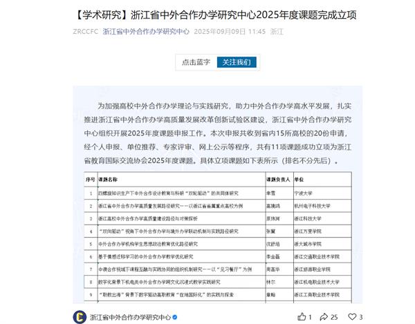 9 月 9 日,浙江省中外合作办学研究中心公布 2025 年度课题立项结果,浙江工商职业技术学院国际商务(中外合作办学)专业章翰老师主持的 “‘职教出海’背景下数字驱动高职教育‘在地国际化’的实践与探索” 课题成功入选。