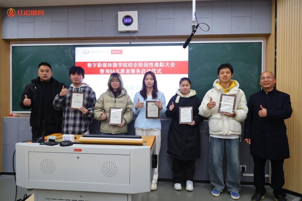 12月24日,数字新媒体微学院校企阶段性表彰大会暨海 BA 志愿者服务启动仪式在思齐楼22A7举行。宁波红运体育有限公司赛事部于总、学院李紫微副院长、电商专业部分教师及学生代表齐聚现场,共同见证这一兼具总结意义与启动价值的重要时刻。本次活动不仅为前期红运体育系列活动中表现突出的拍摄志愿者颁发荣誉,更以海BA志愿者项目启动为契机,深化校企协同育人成效,为双方高质量发展注入新活力。