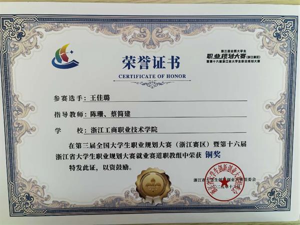 近日,第三届全国大学生职业规划大赛(浙江赛区)暨第十六届浙江省大学生职业规划大赛圆满落幕,我院王佳璐同学凭借清晰的职业规划、扎实的专业素养与出色的现场表现,在就业赛道职教组中脱颖而出,荣获铜奖,充分展现了我校学子在职业发展规划领域的良好风貌与专业实力。