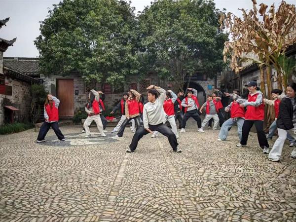 随后,非遗传薪火小分队在童氏宗祠天井开展罗汉拳传承体验。学校非遗罗汉拳传承人郭忠科从基础招式入手,细致示范动作要领,让队员们在反复练习中感受“刚柔并济、形神兼备”的技法特点。