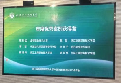 3月13日至14日,浙江省高等教育学会大学外语分会高职组年会在绍兴职业技术学院隆重举行。本次年会以"服务新双高、外语新担当"为主题,聚焦"新双高"背景下高职外语教育的改革与创新。我校国际交流学院钱律伟副教授主持的《训赛服联动,双力赋能:高职外语类专业出海人才培育新路径》案例经过严格评审,从全省众多申报案例中脱颖而出,获评优秀典型案例。钱律伟老师受邀在大会上作专题案例分享,向全省高职外语教育同仁介绍我校应用英语专业的创新实践。