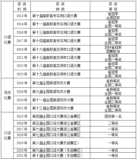 基于“三方联动、模块融合、工学结合”的高职应用英语高技能人才培养模式,2025届毕业生专升本上线率为87.43%,四级过级就给98%左右,六级过级率为60%左右。自2006年以来,专业指导学生获英语口语(A类)省赛国赛84个奖项,其中12名全省冠军,10名学生代表浙江省参加国赛,荣获国赛一等奖3项、二等奖6项、优胜奖1项。